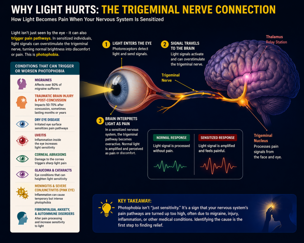 The mechanism behind this involves a pathway in the eye called the intrinsically photosensitive retinal ganglion cells (ipRGCs). These cells detect light intensity and connect directly to pain-processing areas of the brain via the trigeminal nerve. When this pathway is sensitized or disrupted, ordinary light levels register as threatening, and the brain responds accordingly with discomfort or pain signals.