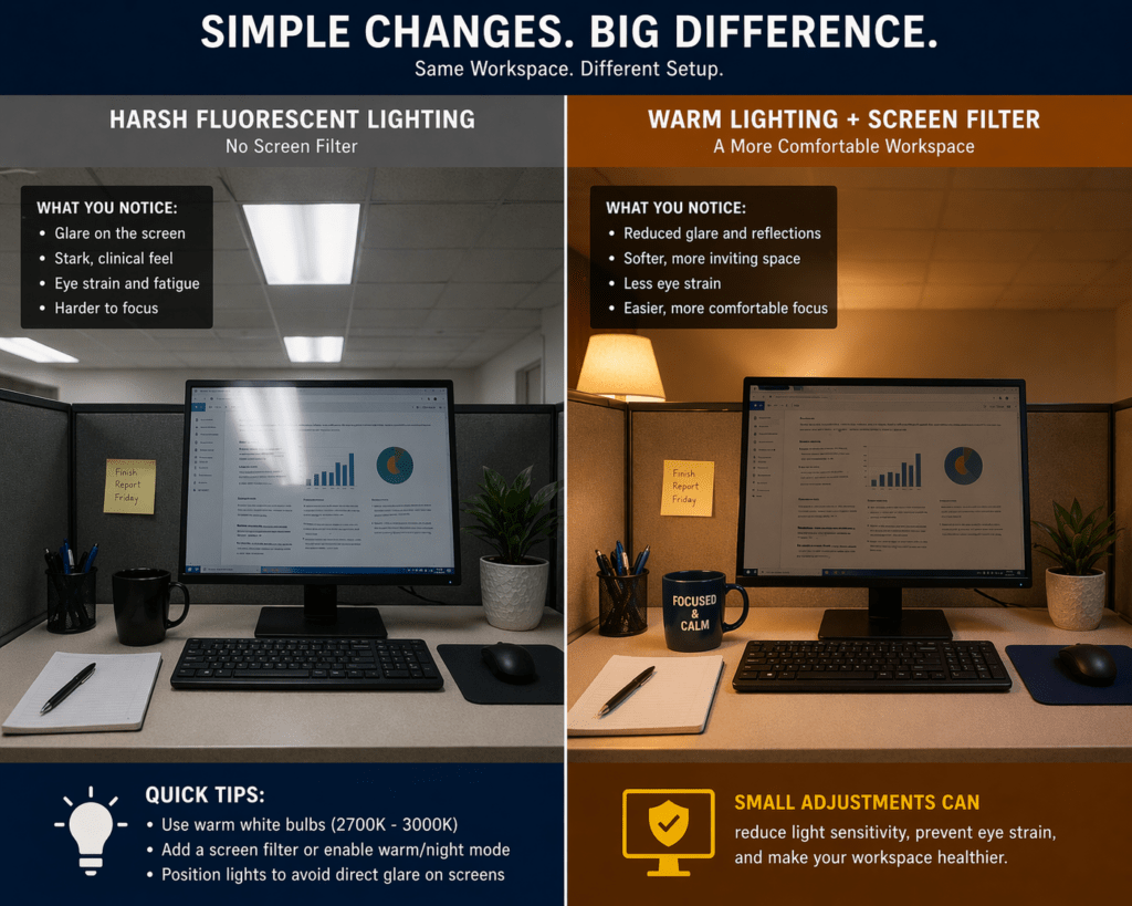 - Adjust your environment strategically. Replace fluorescent bulbs with warm LED alternatives (2700–3000K color temperature). Add glare filters to screens. Use blackout curtains in sleep and work areas where overhead lighting is harsh.